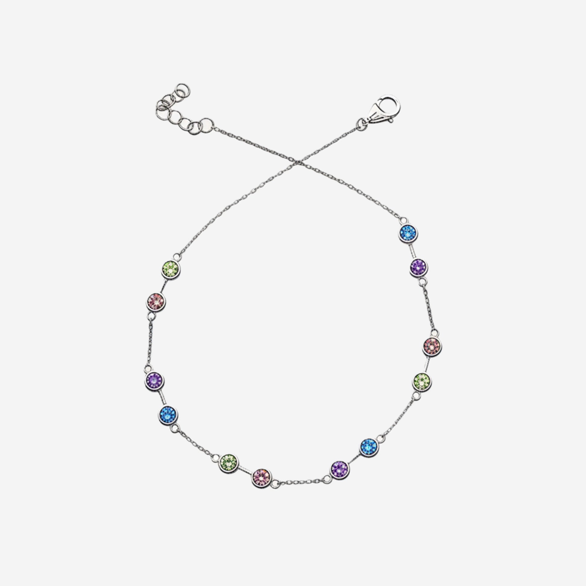 Soft hues meet sleek design in this minimal sterling silver anklet, featuring evenly spaced colorful gemstones for a refined jewelry piece with subtle elegance.