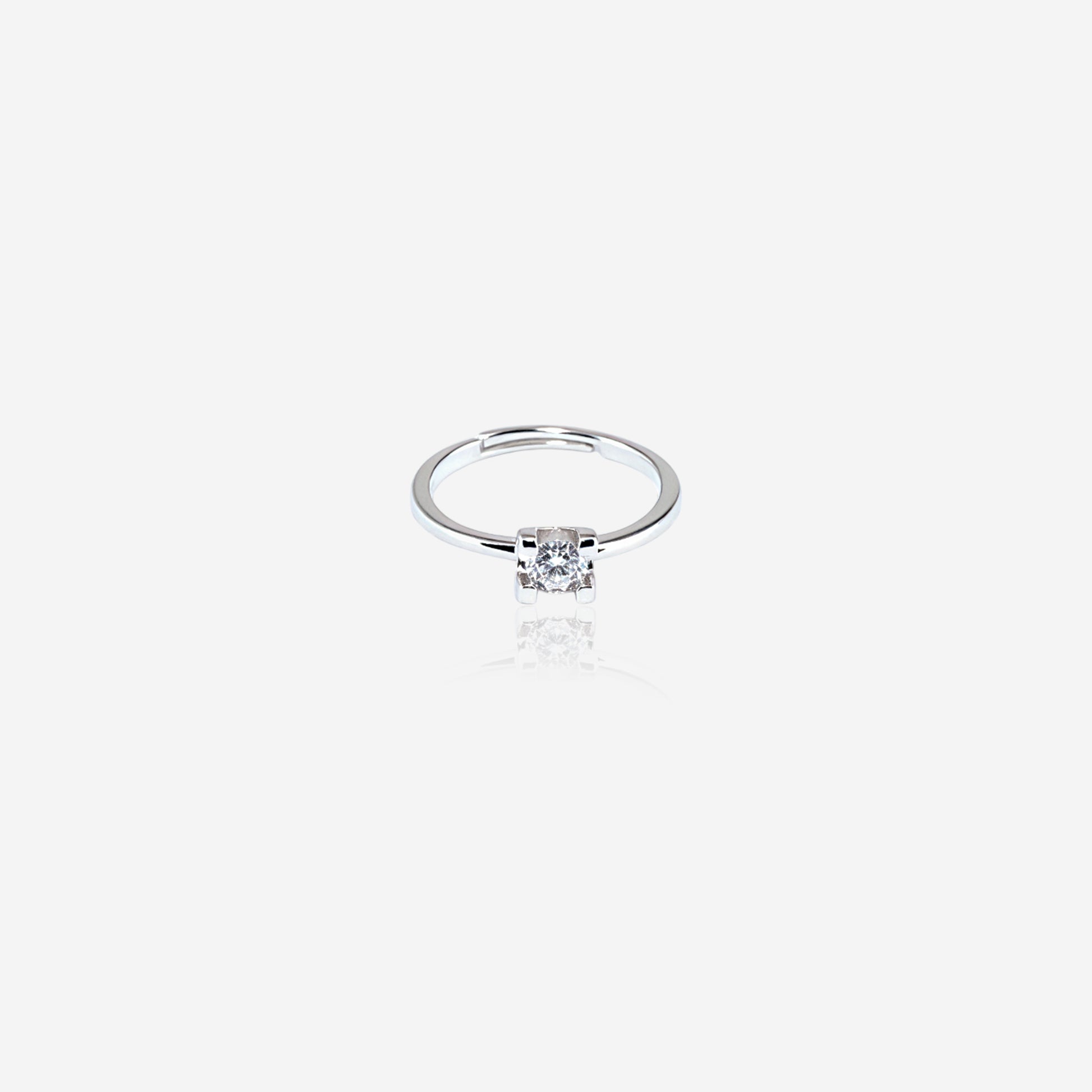 A classic redefined—this sterling silver women’s ring features a single round-cut gem in a prong setting, perched atop a polished band. Its minimal design highlights clean lines and luminous clarity, offering timeless elegance with a modern edge. Perfect for those who favor